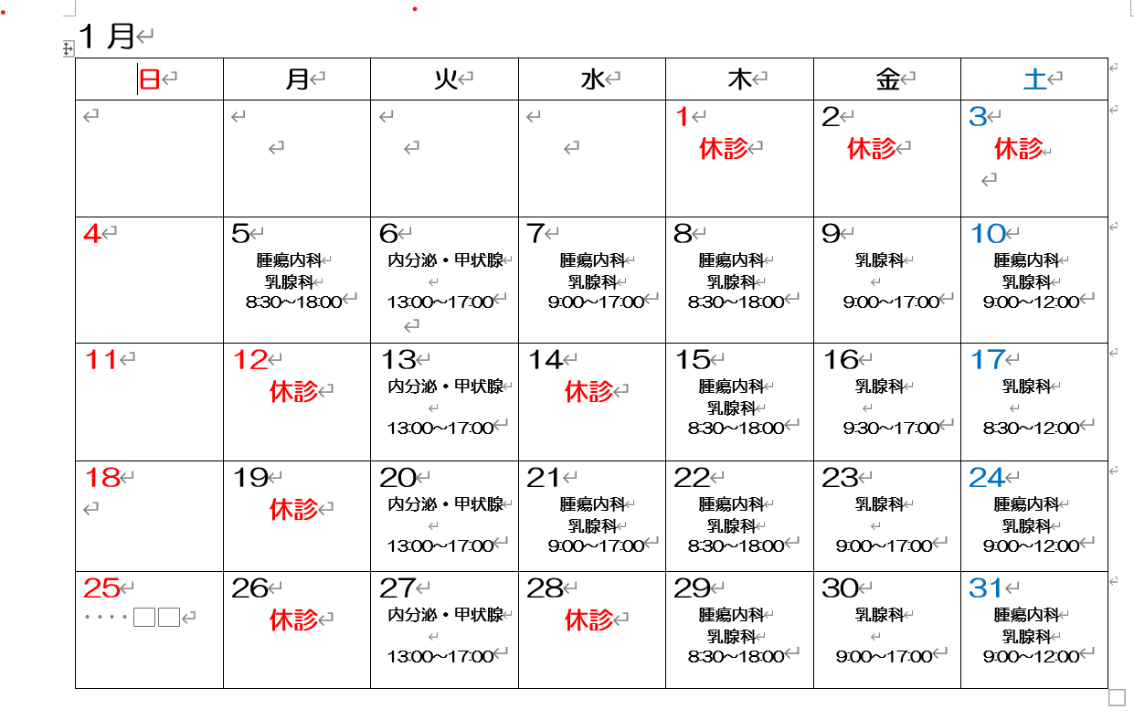 2025.12.25 お知らせ 令和8年1月の診療について 令和8年1月の診察日の変更をお知らせします。 第1水曜日 (Dr.勝俣範之)日本医科大学武蔵小杉病院 第3水曜日 (Dr.小野麻紀子)東京女子医科大学病院 木曜日 (Dr.河野勤)杏雲堂病院 第1金曜日 なし 第2,4,5金曜日 (Dr.谷眞弓)日本大学病院 第1土曜日 なし 第2,4,5土曜日 (交代制) 第3土曜日 (Dr.徳田恵美)福島県立医科大学病院 お知らせ一覧に戻る