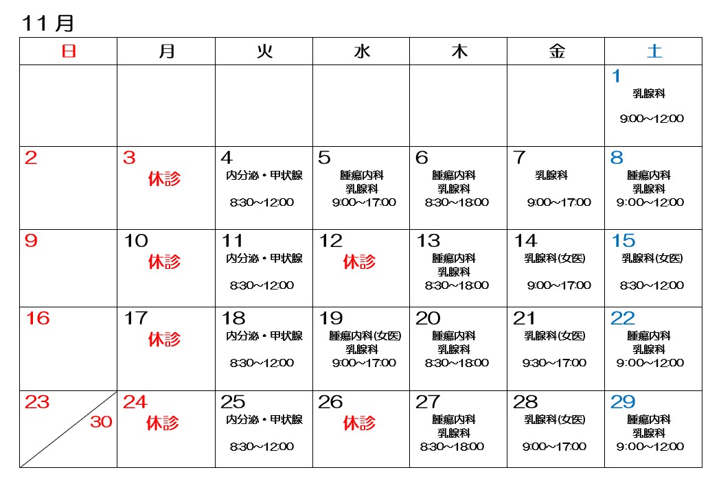 2025.11.19 お知らせ 令和7年11月の診療について 令和7年11月の診察日の変更をお知らせします。 第1水曜日 (Dr.勝俣範之)日本医科大学武蔵小杉病院 第3水曜日 (Dr.小野麻紀子)東京女子医科大学病院 木曜日 (Dr.河野勤)杏雲堂病院 第1金曜日 (Dr.上野貴之)がん研有明病院 第2,4,5金曜日 (Dr.谷眞弓)日本大学病院 第1土曜日 (Dr.小泉圭)浜松医科大学医学部付属病院 第2,4,5土曜日 (交代制) 第3土曜日 (Dr.徳田恵美)福島県立医科大学病院 お知らせ一覧に戻る