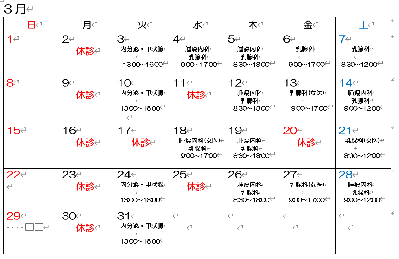 2026.02.04 お知らせ 令和8年3月の診療について 令和8年1月の診察日の変更をお知らせします。 第1水曜日 (Dr.勝俣範之)日本医科大学武蔵小杉病院 第3水曜日 (Dr.小野麻紀子)東京女子医科大学病院 木曜日 (Dr.河野勤)杏雲堂病院 第1金曜日 (Dr.上野貴之)がん研有明病院 第2,4,5金曜日 (Dr.谷眞弓)日本大学病院 第1土曜日 (Dr.吉田雅行)聖隷検診センター 第2,4,5土曜日 (交代制) 第3土曜日 (Dr.吉田雅行)聖隷検診センター お知らせ一覧に戻る